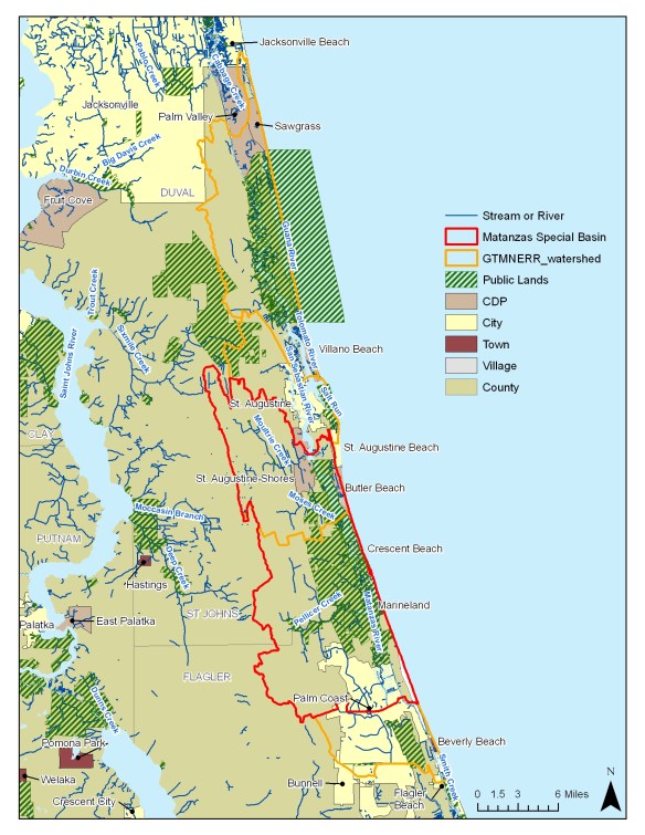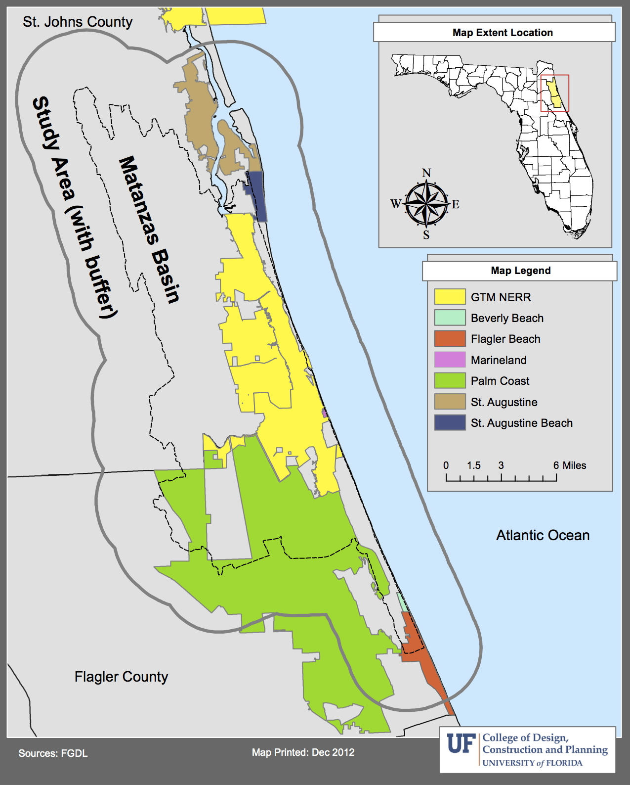 The study area is the Matanzas Basin (or watershed) plus a buffer area that includes the cities of St. Augustine, St. Augustine Beach, Marineland, Palm Coast, Beverly Beach, and Flagler Beach. The study area also includes the unincorporated coastal communities of Vilano Beach, Butler Beach, Crescent Beach, and Summer Haven, and many others east of Palm Coast; and inland communities such as St. Augustine South and St. Augustine Shores. The project team is conducting geographic and ecological analyses, as well as public outreach, in the study area to inform integrated planning for sea level rise.