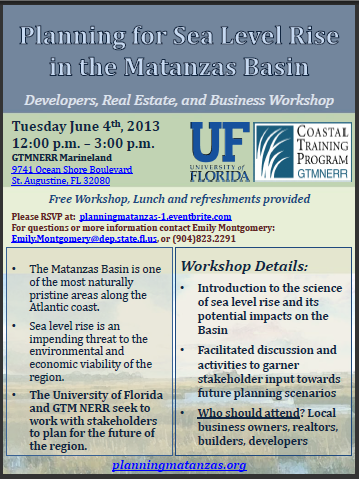 The last professional workshop for developers, real estate and local businesses will be held at the GTM Research Reserve’s Marineland office on June 4th, 12:00-3:00 p.m. Lunch will be provided. Please see the link above to RSVP.