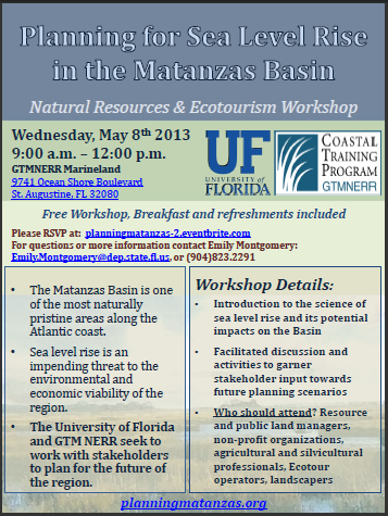 The first set of workshops for professional groups in the Matanzas area, including St. Augustine and Palm Coast, will be held in May and June at the GTM Research Reserve office in Marineland. The first workshop on May 8th, 9:00am-12:00pm, is designed for representatives of natural resource and ecotour businesses. The second workshop on May 9th, 9:00am-12:00pm, is intended for local government officials and planners, and members of state and federal agencies with local interests. The third workshop on June 4th, 12:00-3:00pm, is geared towards urban developers, real estate professionals, and other business and economic development representatives. At each workshop, researchers from the University of Florida will present the science of sea level rise and its potential impacts on the Matanzas area. Workshop facilitators will ask participants for their preferences of what places to protect and what adaptation strategies to use. If you are a professional, please visit Events for specific information and to RSVP for the workshop that is the best fit and most convenient for you. Your participation is important for gaining awareness of important issues of coastal change and how they affect you, and for guiding  integrated planning for community and environmental adaptation.