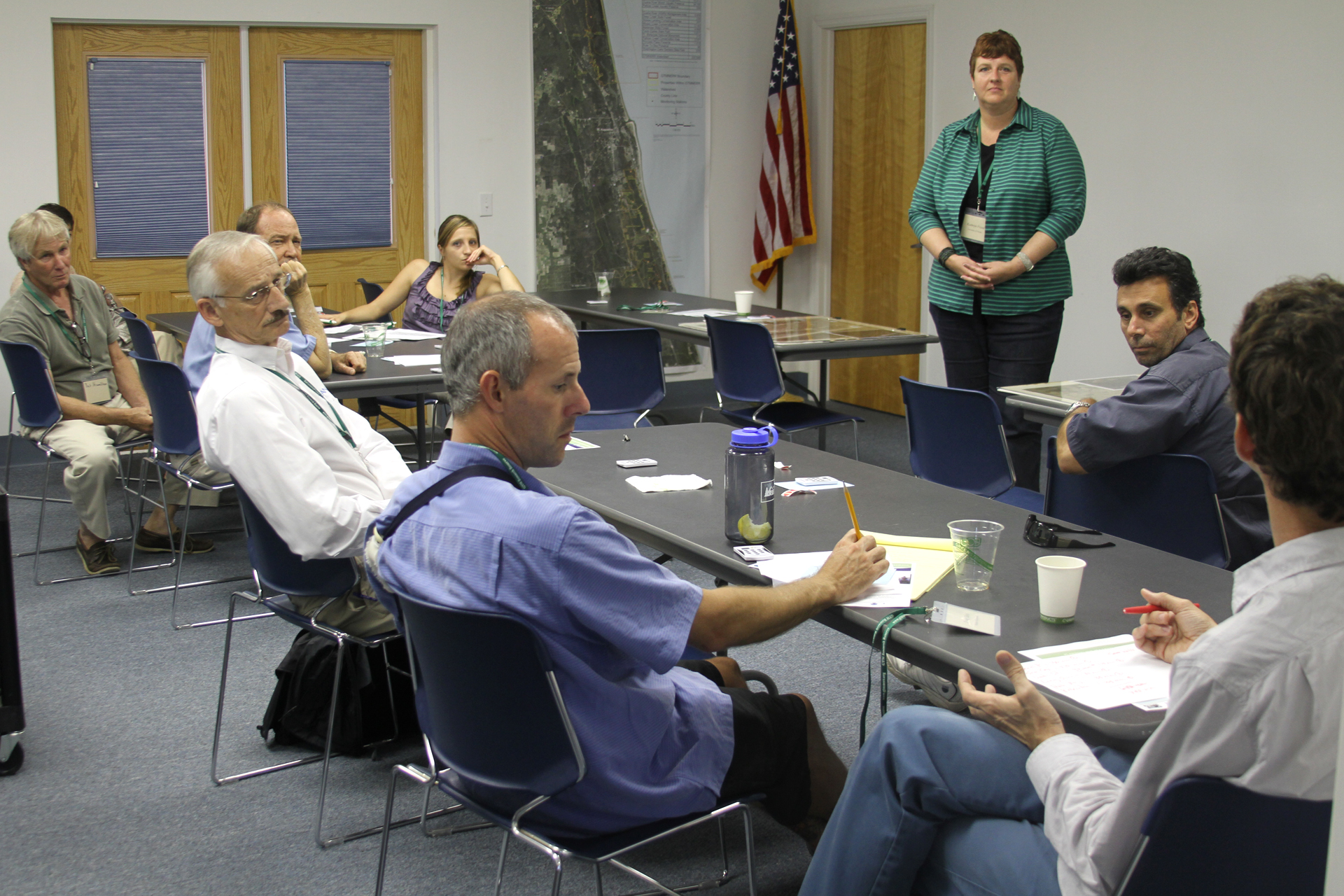 Doug Davis (far right) discusses his group’s results from the sea level rise adaptation strategy game.