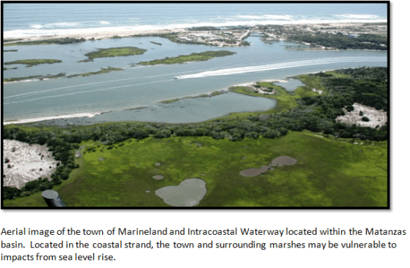 The Matanzas Basin, or watershed, is about 25 miles long by 10 miles wide, covering 100,000 acres in St. Johns and Flagler Counties, Florida, between the growing cities of St. Augustine and Palm Coast, and rural lands to the west. It is relatively flat, and surface water flow, waves, currents and tidal forces influence the soil types.